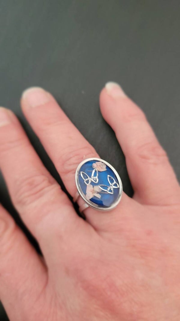 À l'intérieur, de véritables fleurs séchées rose poudré côtoient de gracieux papillons argentés finement ciselés. La transparence de la résine offre un effet de dôme qui magnifie chaque détail de cette scène miniature. Grâce à son anneau ajustable, elle s'adapte avec élégance à toutes les mains.